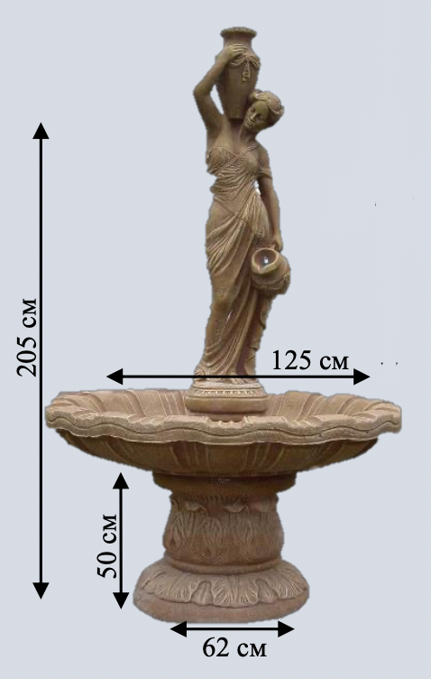 Високий фонтан зі статуєю Аполлона — бога мистецтв. Класичні античні риси та ідеальні пропорції. Одна масивна чаша створює потужний водний потік.