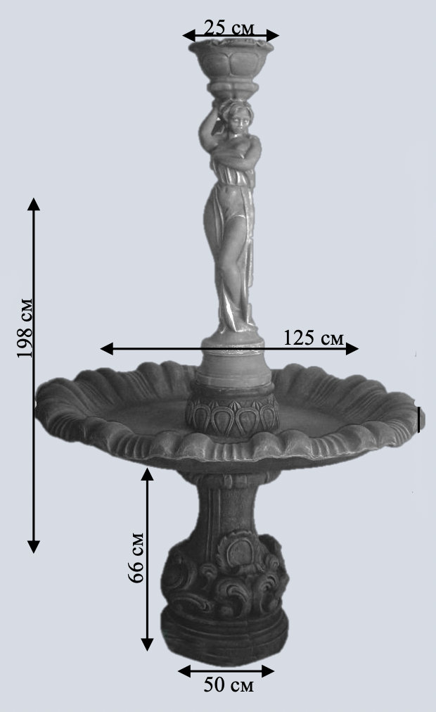 Високий фонтан зі статуєю бога війни Ареса. Войовнича постать у повному обладунку. Одна масивна чаша.
