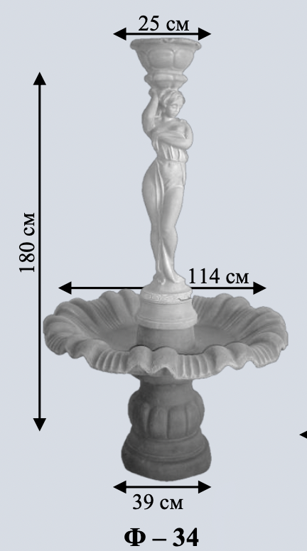 Високий фонтан зі статуєю богині весни Флори. Витончена жіноча постать тримає квіти та вазу. Одна декоративна чаша з рослинними мотивами.