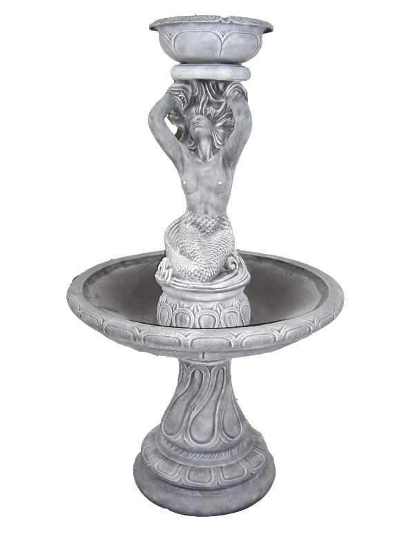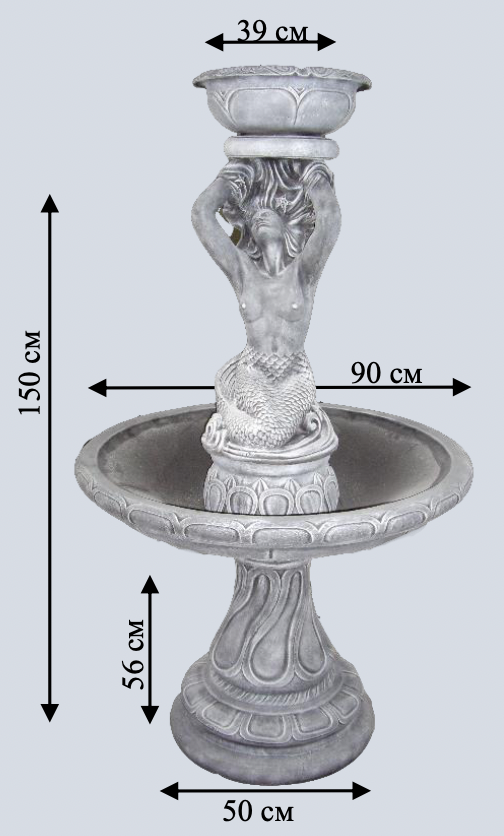 Елегантний фонтан з витонченою скульптурою русалки. Плавні лінії та художня деталізація створюють неповторний образ. Широка чаша забезпечує гарний ефект переливу води.