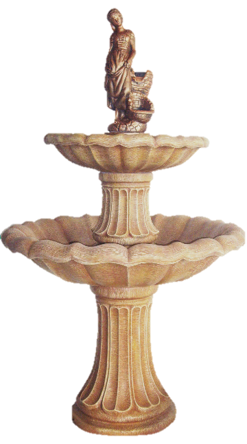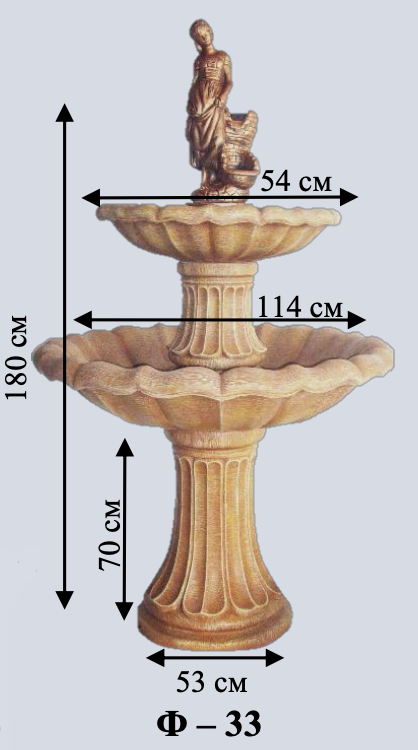 Високий двоярусний фонтан зі статуєю Гермеса — посланця богів. Дві чаші різного розміру створюють гармонійний каскад. Класичний дизайн для цінителів античності.