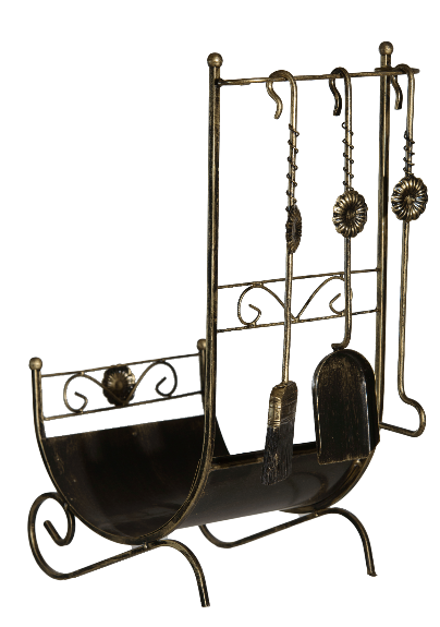 Елегантний камінний набір із чотирьох предметів на компактній стійці. Кована фурнітура надає вишуканості кожному елементу. Ідеальне рішення для класичного каміна у вітальні.