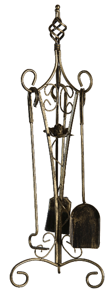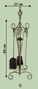 Стильний камінний комплект із кованими завитками на стійці. Набір містить усі потрібні аксесуари для каміна. Надійна конструкція витримує щоденне використання.