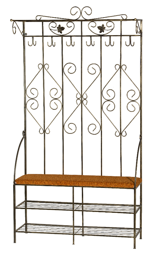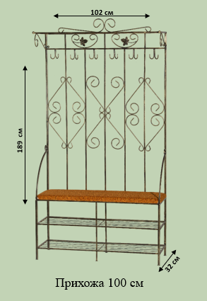 Повноцінна кована прихожа шириною 100 см з гачками та полицею для взуття. Висока конструкція дозволяє повісити верхній одяг та сумки. Надійний метал витримає щоденне навантаження протягом багатьох років.