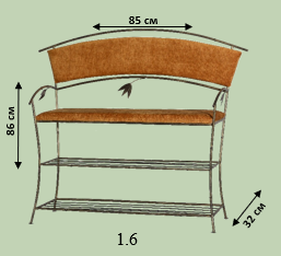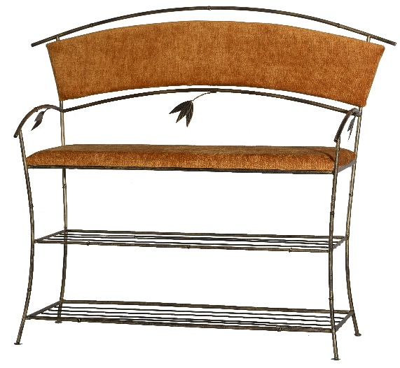 Великий кований пуф із декоративними елементами на ніжках. Розмір сидіння дозволяє комфортно розміститися двом дорослим. Вишуканий орнамент ковки робить його центром уваги.