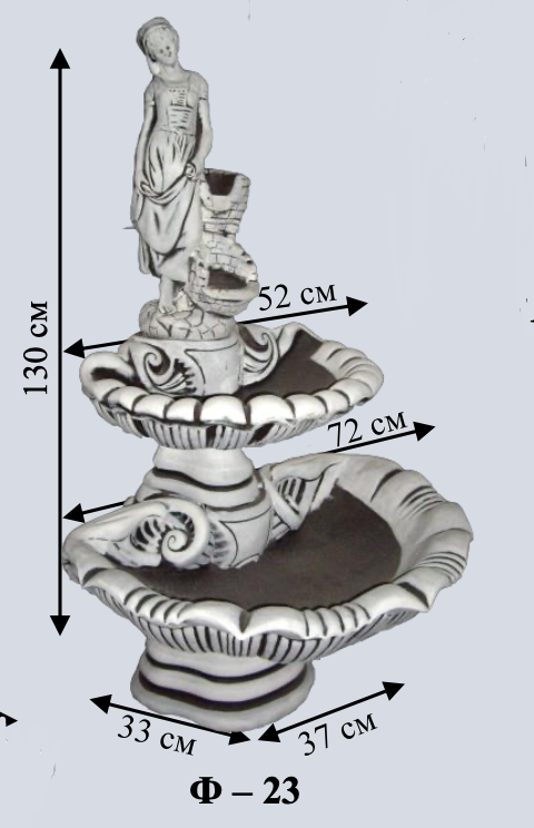 Розкішний двоярусний фонтан у стилі бароко. Багата деталізація та плавні лінії створюють неповторний образ епохи Відродження. Справжній витвір мистецтва для цінителів класики.
