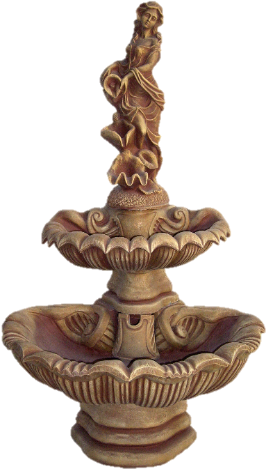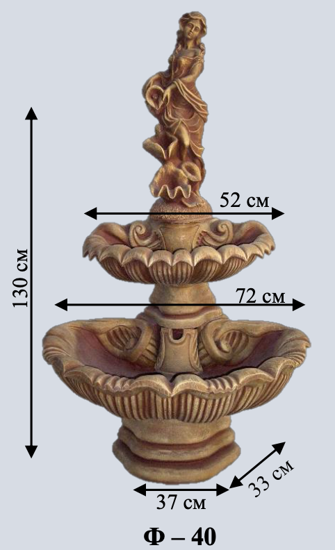 Середній двоярусний фонтан зі статуєю матері з дитиною. Теплий сімейний образ створює затишну атмосферу. Дві чаші різного розміру.