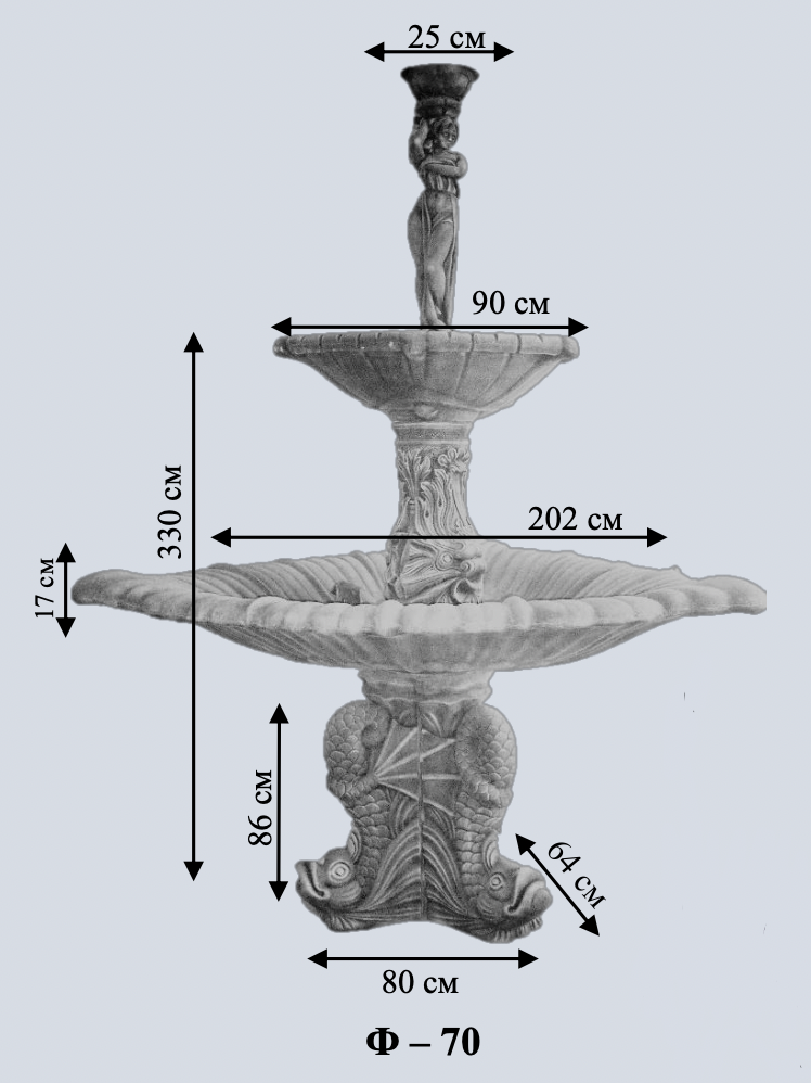 Грандіозний фонтан у стилі Версальського палацу. Дві широкі чаші та величезна статуя. Для тих, хто цінує справжню розкіш.