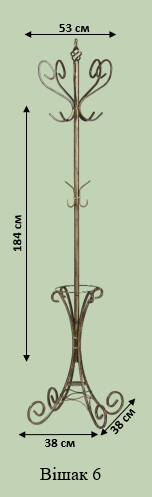 Напільний кований вішак-стійка з елегантними лініями та завитками. Висока конструкція із широкою основою для максимальної стійкості. Класичний дизайн пасує до традиційних інтер'єрів.